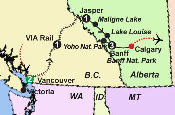 The Canadian winds along the North Thompson River passing towering peaks and glacial valleys in a vast wilderness once only accessible by rail. Enjoy incredible scenery like Mt. Robson. Cross the Continental Divide into Alberta, arriving in Jasper. This afternoon discover Jasper National Park, a photographer’s paradise. Visit Maligne Canyon and watch for wildlife as you coach to the crystal blue waters of Maligne Lake, the largest natural lake in the Canadian Rockies. |