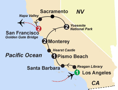 Today enjoy one of the most breathtaking coastlines in the world, scenic 17-Mile Drive, home to the famous Lone Cypress, Seal Rock, and Pebble Beach Golf Course. Also drive through and visit quaint Carmel to view tree-lined Ocean Avenue. Later travel to Old Monterey filled with historic buildings and where California’s statehood began in 1849. This afternoon enjoy time at your own pace. Shop and eat in Cannery Row and/or Fisherman’s Wharf which reflect the city’s long history with the sea. Later maybe visit the famous Monterey Bay Aquarium. |