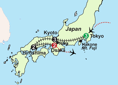 Enjoy a scenic day trip to Mt. Fuji & Hakone. Board the Hakone Ropeway, an aerial lift offering stunning views of Mt. Fuji, Lake Ashi, and the Owakudani Valley. Then enjoy a scenic Lake Ashi Cruise. The crater lake was formed 3000 years ago when Hakone volcano last erupted. Today Mt. Fuji sits in the background for spectacular views on a clear day. Lunch is included at a local restaurant. Later return to Toyko and enjoy the evening at leisure. Please note Mt. Fuji views are weather permitting. |