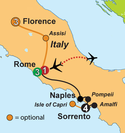 Travel to Pompeii, buried in volcanic ash when Mt. Vesuvius erupted in 79 AD, stopping time it in its tracks. Walk through city streets on a guided visit and discover remarkably preserved architecture and artifacts. Next, travel to Naples and enjoy a panoramic city tour. See the Cathedral, from the 4th c., Royal Palace, the beautiful church of St. Francesco di Paula, Town Hall Square and more. Enjoy a pizza making class and lunch. Arrive in Rome later today for an overnight stay. |