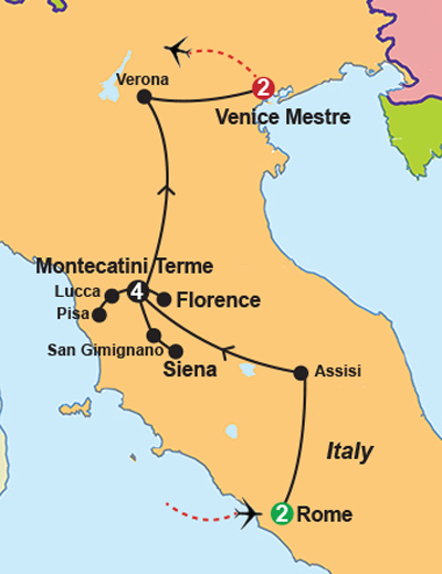 Travel north into the Umbrian countryside to the beautiful hilltop town of Assisi. During your Assisi Walking Tour visit both the upper and lower parts of the great Basilica of St. Francis. Everything here is in some way associated with St. Francis, who was born here in 1182. Later arrive in the Tuscan resort and spa town of Montecatini Terme for a four night stay. |